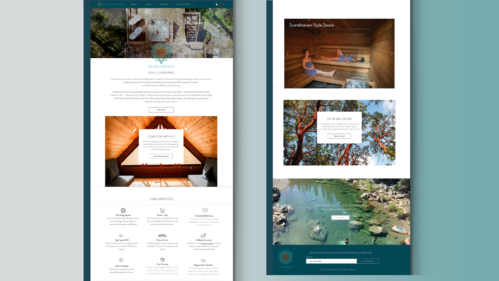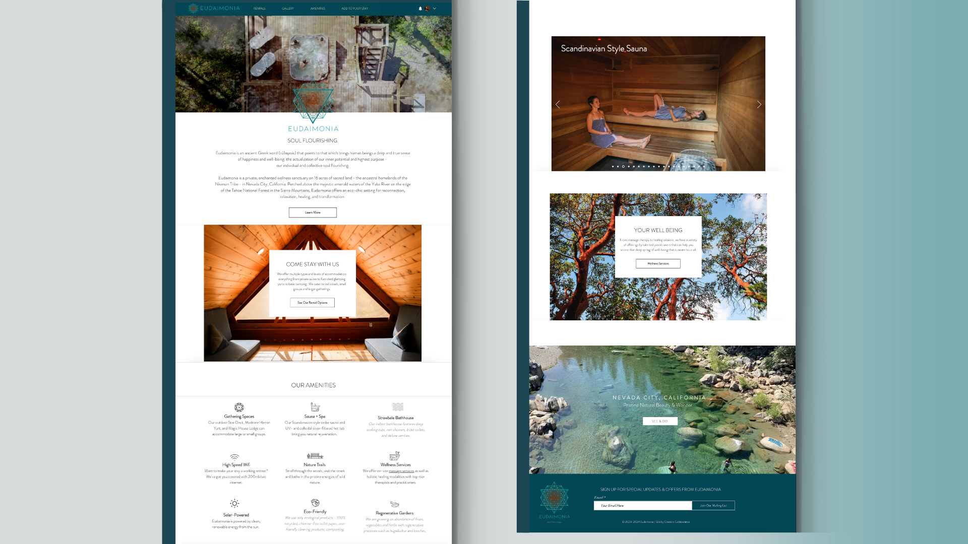 With its serene location and multiple stay offerings, Eudaimonia was in need of a website that not only reflected the beauty and peacefulness of its sacred grounds but also provided a seamless and user-friendly platform for visitors to book retreats, wellness packages, and accommodations. The goal was to build a site that showcased the space—ranging from Airbnb-style personal stay rentals to full space rental options—while capturing the spirit of Eudaimonia as a holistic hub for thriving.